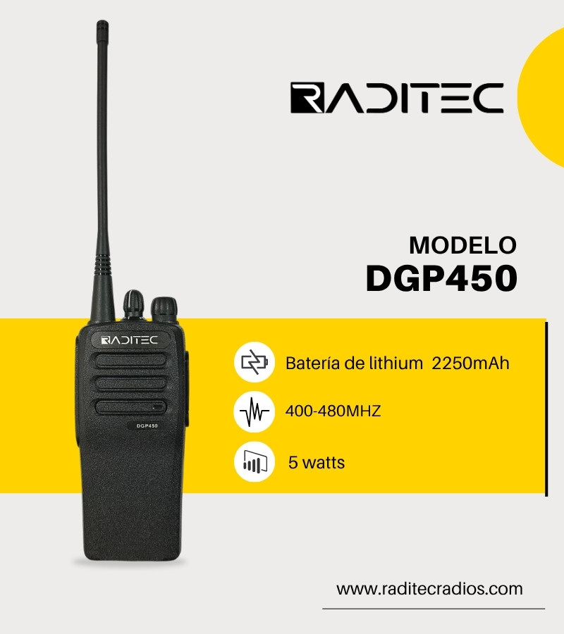 Radio de 32 canales análogo de 5 vatios, bidireccional con funciones de Codificador de 8 grupos, Temporizador de tiempo de espera, Transmisión por voz manos libres (VOX), Conmutable de alta / baja potencia, Anuncio de voz, Codificación y descodificación DTMF, Función de espectro ensanchado por salto de frecuencia